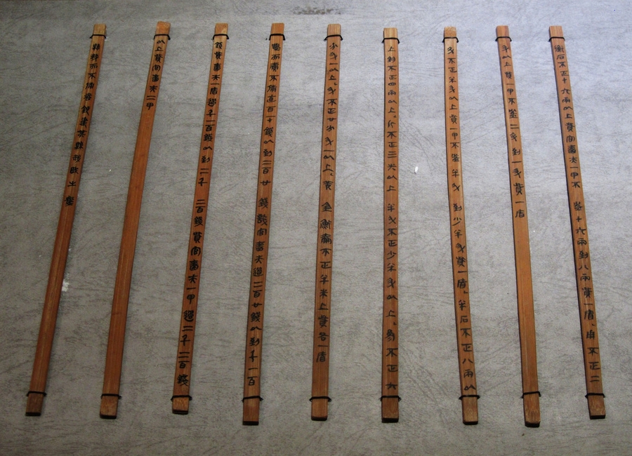 秦代部分文字已开隶书先河。1975 年,今湖北境内出土了千余枚秦代竹简,上面的字迹清晰可辨,字体脱胎于小篆,刚直浑厚、古拙稳重。据推测,这种文字是秦代小篆向汉代隶书过渡时期的中间产物,起 “承上启下” 之效。